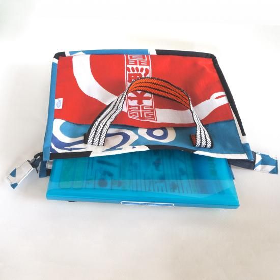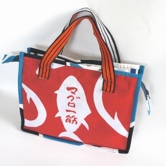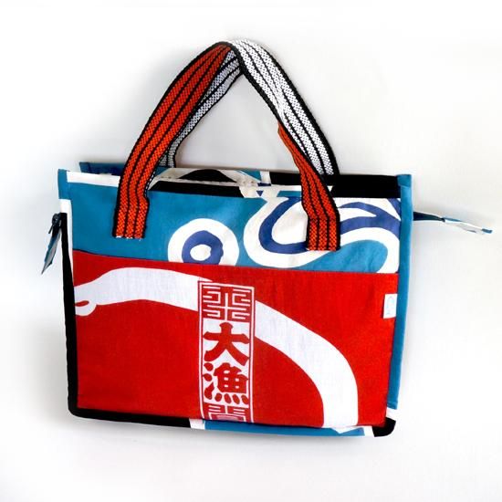 大間の大漁手ぬぐい・猩々緋(しょうじょうひ)と大漁旗のコラボバッグです。