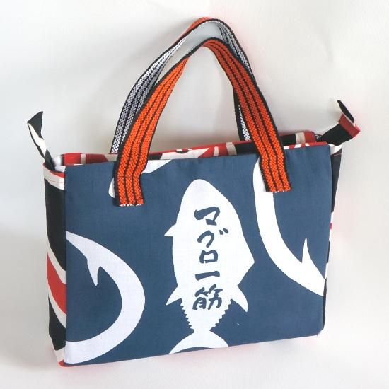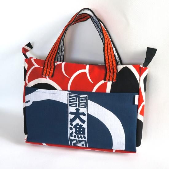 大間の大漁手ぬぐい・青褐(あおかち)と大漁旗のコラボバッグです。